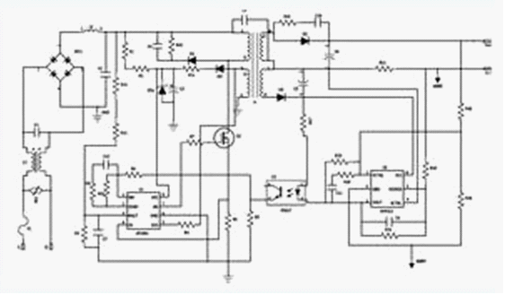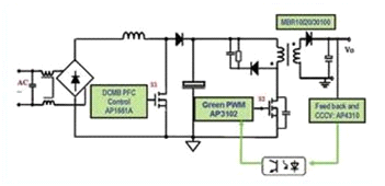 在更大功率應(yīng)用條件下,單級PFC電路難以同時兼顧PFC預(yù)調(diào)整和反激電路輸出恒流調(diào)整性能,這時需要采用兩級電路架構(gòu)實現(xiàn)這一目標。因此,有新推出的PFC+PWM 兩級架構(gòu)電路拓撲方案,該方案電路原理圖如圖9所示。