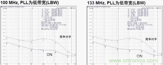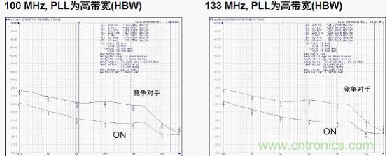 另外,多個(gè)PLL分層布置時(shí),用戶(hù)可調(diào)節(jié)帶寬對(duì)時(shí)鐘樹(shù)進(jìn)行系統(tǒng)優(yōu)化。使用HBW(高帶寬)擴(kuò)頻時(shí)鐘時(shí)用于維持?jǐn)U頻特性,從而將輸入與輸出相位差減至最??;使用LBW (低帶寬)可濾除PLL帶寬內(nèi)的時(shí)鐘輸入抖動(dòng)。