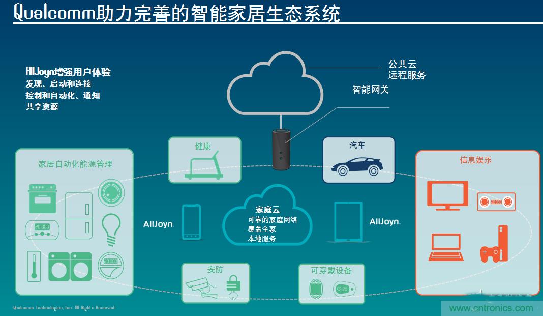 Qualcomm創(chuàng)銳訊物聯(lián)網(wǎng)市場經(jīng)理貝曉珊女士在 “IoE互聯(lián)家庭解決方案概述”主題演講中談到,盡管不同的分析機構(gòu)給出了不同的數(shù)據(jù),但結(jié)論是統(tǒng)一的,即物聯(lián)網(wǎng)市場規(guī)模的巨大化。而高通創(chuàng)銳訊將致力于端到端的IOE解決方案,助力完善智能家居生態(tài)系統(tǒng)。會議上貝曉珊詳細(xì)介紹了兩款WIFI芯片產(chǎn)品QCA4004和QCA4531以及AllJoyn SDK軟件平臺。