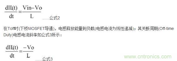 電感電流函數(shù)IL(t)可由公式2求得,其波形如圖2所示。在Ton時(shí)(上橋MOSFET導(dǎo)通),輸入電源VCC供應(yīng)能量到負(fù)載端且電感組件儲(chǔ)存磁能(電感電流為線性遞增),依據(jù)法拉第定律(Faraday''s Law):
