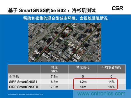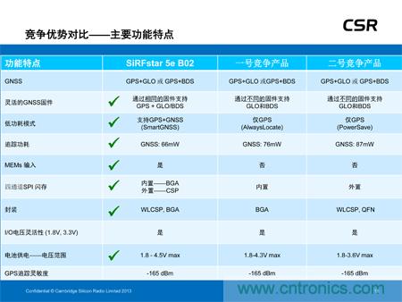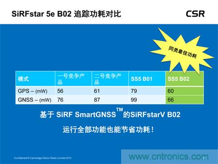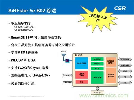 可穿戴設(shè)備應(yīng)用。該低功耗器件現(xiàn)已全面投入生產(chǎn),不僅可大幅度降低功耗且不影響定位精度,還可提供多衛(wèi)星GNSS支持,可滿足所有地區(qū)對(duì)GNSS的需求,包括美國(guó)的GPS、歐洲的伽利略、俄國(guó)的Glonass及中國(guó)的北斗衛(wèi)星系統(tǒng)。此外,SiRFstar 5e B02還搭載了CSR全新的SmartGNSS技術(shù),可提供兩種模式最大程度地降低功耗,并能夠根據(jù)信號(hào)條件及衛(wèi)星可用性自主管理GNSS系統(tǒng)的應(yīng)用。