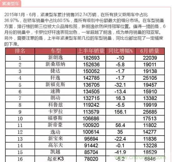 據(jù)中國(guó)汽車工業(yè)協(xié)會(huì)發(fā)布的數(shù)據(jù),2015年6月,汽車產(chǎn)銷量環(huán)比下降,同比繼5月后再次雙雙下降;上半年,汽車產(chǎn)銷增速比上年同期明顯回落。說(shuō)到汽車,小編想到了由我愛(ài)方案網(wǎng)承辦的“創(chuàng)業(yè)之星”2015全球創(chuàng)客大賽成都賽場(chǎng)中的一個(gè)參賽項(xiàng)目:智能車載太陽(yáng)能轉(zhuǎn)化防護(hù)裝置,它改變?cè)扔扇斯ふ周囐M(fèi)時(shí)費(fèi)力方法,完全達(dá)到遙控自動(dòng)罩車,屬于汽車產(chǎn)品領(lǐng)域的一項(xiàng)新技術(shù),歡迎大家到淘方案上了解詳情!下面跟著小編來(lái)看看中國(guó)汽車在2015年1月-6月的銷量數(shù)據(jù)!歡迎參與互動(dòng)分享!