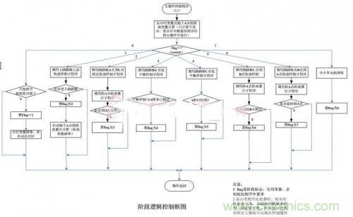 系統(tǒng)框圖如圖3所示,主控循環(huán)程序每隔一個采樣周期從FPGA接口中讀取各個傳感器的數(shù)值,并經(jīng)過處理后獲得小車的運行狀態(tài),根據(jù)小車的當(dāng)前狀態(tài)采取相應(yīng)的控制算法計算出電機所需的控制電壓值,進而,該控制電壓值經(jīng)過PMW處理后輸出到小車驅(qū)動電機,使小車按照希望的規(guī)律運動。為了使程序流程清晰簡潔,框圖中以一個標(biāo)志信號來記錄小車所運行的階段,控制器則根據(jù)小車所處的運行階段進行相應(yīng)的控制。