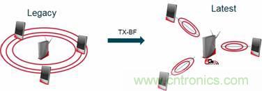 圖1. 借助 802.11ac(和802.11n)波束成形技術,無論周邊有多少設備,集線器或AP都能讓無線信號直接傳向需要信號的設備。與此形成對比的是,傳統(tǒng)Wi-Fi技術只能在設定區(qū)域輻射無線信號,而該區(qū)域內的任何設備都能接收該信號。
