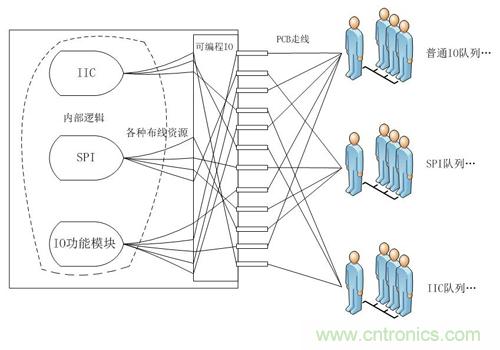 實際FPGA內(nèi)部并不像圖2那么簡單,這里只是為了形象說明可編程IO可以使內(nèi)部邏輯和PCB可以相對獨立設計。對于同類接口,不必因為PCB改變而更改時序邏輯,只需要更改引腳分配,大大簡化了PCB的布線難度。