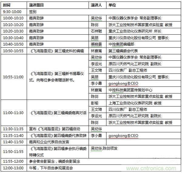 中國儀器儀表學(xué)會(huì)常務(wù)副理事長吳幼華,浙大工業(yè)控制技術(shù)國家重點(diǎn)實(shí)驗(yàn)室陳劍教授,重慶工業(yè)自動(dòng)化儀表研究所石祥聰所長,重慶川儀自動(dòng)化股份有限公司總經(jīng)理吳朋,中控集團(tuán)編輯部裘曉景將分別發(fā)表致辭,闡述中國儀表和自動(dòng)化的發(fā)展與現(xiàn)狀。林寰寓將代表第三輯編委會(huì)與大家分享《飛鴻踏雪泥》第三輯史料編輯的心路歷程,gongkong®CEO李小勇將與吳幼華、李運(yùn)光、王文琦等專家一起參加《飛鴻踏雪泥》第三輯新書揭幕儀式及嘉賓對(duì)話環(huán)節(jié)。李小勇先生還將代表《飛鴻踏雪泥》第四輯編委,發(fā)表致辭,預(yù)祝第四輯出版成功!