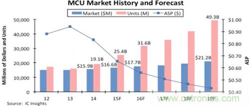 盡管將來(lái)的ASP還會(huì)繼續(xù)下滑,IC Insights預(yù)測(cè)明年的微控制器收會(huì)增長(zhǎng)7%至177億美元,全球的出貨量會(huì)增長(zhǎng)25%至316億顆。