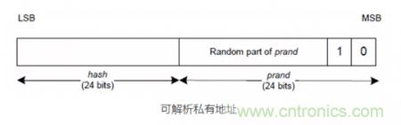 當(dāng)設(shè)備B需要生成隨機地址的時候,其內(nèi)部會首先生成一個隨機數(shù)prand,基于prand隨機數(shù),設(shè)備B需要利用哈希hash算法生成可解析隨機地址的另外一部分,hash。prand隨機數(shù)和哈希hash分別占用24比特,計算公式為: