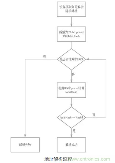 如果生成的本地哈希localHash與拆分得到的哈希hash相等,說明這個地址是設(shè)備B所產(chǎn)生的可解析隨機地址;如果不等,代表解析失敗。設(shè)備A可以利用其獲取的其他設(shè)備的IRK對這個地址就行解析。下圖是一個地址解析的流程圖。