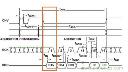 公司帶SPI接口的許多SAR ADC都是從CS或CNV的下降沿為MSB提供時(shí)鐘信號,剩余的數(shù)據(jù)位則跟隨SCLK的下降沿,如圖3所示。在讀取MSB數(shù)據(jù)時(shí),要使用等式中的tEN而非tDRV。