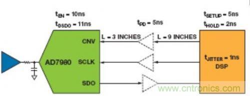 在圖4中,DSP主機(jī)訪問AD7980處于3線CS模式下,其中,VIO = 3.3 V。DSP鎖存SCLK下降沿上的SDO信號。DSP的額定最小建立時(shí)間為5 ns,最小保持時(shí)間為2 ns。對于典型的FR-4PCB板,傳播延遲約為180 ps/in。緩沖器的傳播延遲為5 ns。CNV、SCLK和SDO的總傳播延遲為