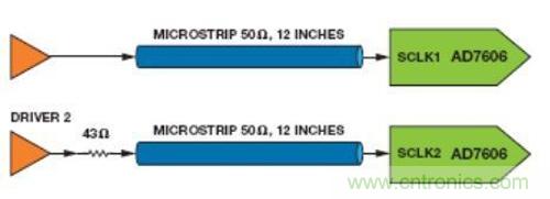 在圖7中,一個(gè)驅(qū)動器通過一條12英寸的微帶線路連接SCLK1,另一個(gè)驅(qū)動器通過一個(gè)與微帶串聯(lián)的43Ω電阻連接SCLK2。