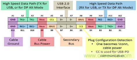 圖1:USB Type-C的接口功能定義,從結(jié)構(gòu)上實(shí)現(xiàn)了無方向正反插