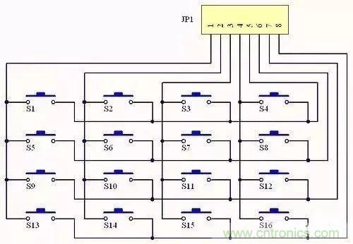 圖a是矩陣鍵盤電路,圖b是筆者焊接的矩陣鍵盤。這是一個利用了元器件自身結構的典型例子:圖b中的輕觸式按鍵有4只腳,其中兩兩相通,我們便可以利用這一特點來簡化連線,電氣相通的兩只腳充當了跳線。讀者可以對照圖c好好體會一下。