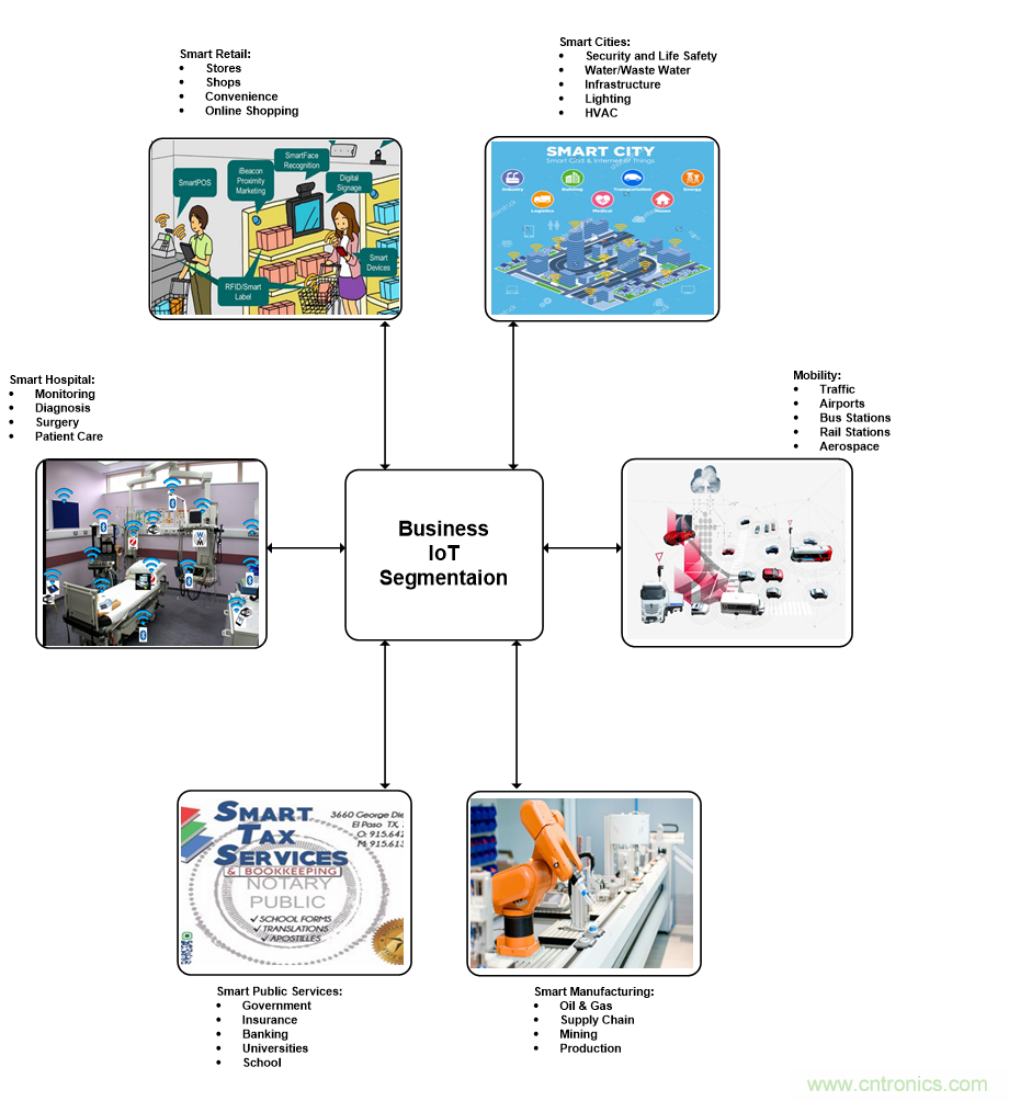 企業(yè)物聯(lián)網(wǎng)的覆蓋范圍巨大,包括零售、醫(yī)療、能源、出行、城市、制造業(yè)和公共服務。企業(yè)物聯(lián)網(wǎng)細分市場會改變組織和社區(qū),從而創(chuàng)造一個實現(xiàn)經(jīng)濟增長的新時代。物聯(lián)網(wǎng)通過連接數(shù)據(jù)、人員和機器來提高生產(chǎn)力、生產(chǎn)效率以及日常運營水平。企業(yè)物聯(lián)網(wǎng)也可以作為幫助企業(yè)識別未開發(fā)領(lǐng)域新增長機會的工具。