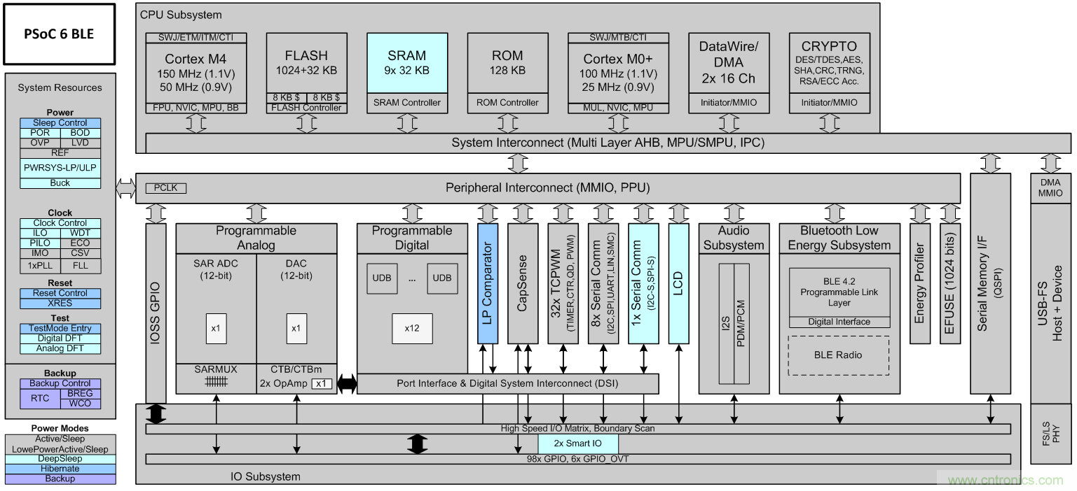 在考慮 MCU 的功耗模式時,超越其基本架構(gòu)十分重要。例如,標準 ARM CPU 內(nèi)核支持運行、睡眠和深度睡眠。附加功耗模式通常由特定的 MCU 供應商添加。例如,賽普拉斯的 PSoC 6 BLE MCU可執(zhí)行包括,低功耗運行、低功耗睡眠和休眠狀態(tài)在內(nèi)的六種工作功耗模式。