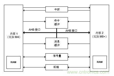 消息隊列:消息隊列使用共享內(nèi)存的兩個區(qū)域來存儲每個核心發(fā)送給另一個核心的消息。第一個區(qū)域是被稱為命令緩沖器的專用存儲器,用于存儲從主機發(fā)送到從機的命令。另一個專用存儲器被稱為消息緩沖器,它使從機能夠響應主機。