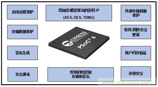 與固件相比,安全硬件還具有提供更快性能和更低功耗的優(yōu)勢。比如,賽普拉斯 PSoC 6 BLE MCU 中的專用加密模塊可加速加密功能。此外,該模塊提供了真隨機數(shù)生成功能、對稱密鑰加密和解密、哈希、消息認證、隨機數(shù)生成(偽隨機和真隨機)、循環(huán)冗余校驗以及諸如啟用/禁用、中斷設置和標記等實用功能。該 MCU 組件還配備了安全啟動功能。該功能使用 ROM 程序在閃存中驗證用戶數(shù)據(jù)。安全啟動是一項包含加密技術(shù)的過程,它使物聯(lián)網(wǎng)設備開始執(zhí)行已認證的可信軟件。因此,系統(tǒng)可以從一個已知、可信的狀態(tài)開啟。