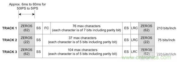 根據(jù)信息量的多少,數(shù)據(jù)將被編碼在不同的行,這個(gè)行被稱為磁道。一個(gè)磁卡上最多可以有3條磁道。