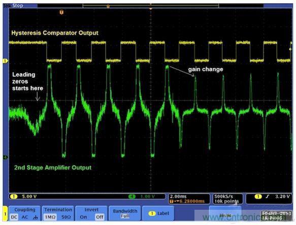圖6顯示了一個(gè)完整的系統(tǒng)。最好將放大電路做成兩級(jí),用ADC接收第一級(jí)電路的輸出。這樣就無需高分辨率ADC,8位ADC就足以滿足這種應(yīng)用需求。第一級(jí)可以是固定增益的放大器,也可以是可變增益放大器。第二級(jí)是可變增益放大器。CPU讀取ADC結(jié)果,并通過調(diào)整增益使第二級(jí)放大器的信號(hào)輸出達(dá)到最佳。第二級(jí)放大器的輸出送到峰值檢測器/磁滯比較器電路進(jìn)行峰值檢測。來自檢測器的脈沖輸出被饋送至定時(shí)器進(jìn)行時(shí)間差測量,然后由CPU解碼出1和0。