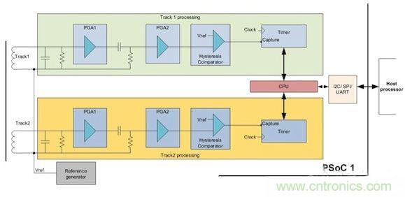 圖9顯示了基于賽普拉斯PSoC 1的雙磁道磁卡讀卡器實(shí)現(xiàn)方案。PSoC 1處理器具有與8位處理器內(nèi)核集成在一起的可配置模擬和數(shù)字塊,在單顆芯片上集成了所有的功能。需要注意的是,圖中所示的無源器件是在處理器的外部。