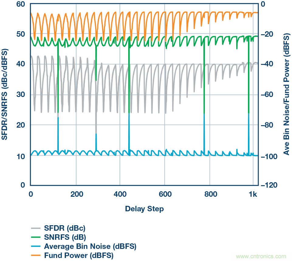 為了獲得最佳延遲設(shè)置,將一個(gè)信號(hào)施加于THA和ADC組合,該信號(hào)應(yīng)在ADC帶寬范圍之外。本例中,我們選擇一個(gè)約10 GHz的信號(hào),并施加-6 dBFS的電平(在FFT顯示屏上捕獲)。延遲設(shè)置現(xiàn)在以二 進(jìn)制步進(jìn)方式掃描,信號(hào)的電平和頻率保持恒定。在掃描過(guò)程中顯示并捕獲FFT,收集每個(gè)延遲設(shè)置對(duì)應(yīng)的基波功率和無(wú)雜散動(dòng)態(tài)范圍 (SFDR) 數(shù)值。