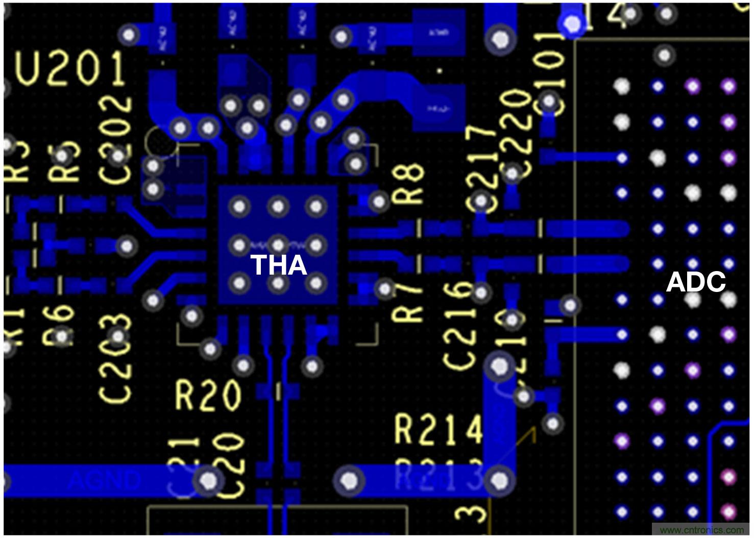 信號(hào)通過(guò)差分模式連接到THA輸入(我們同時(shí)是也提供單端射頻信號(hào)輸入的參考設(shè)計(jì)鏈路),形成單一前端網(wǎng)絡(luò)。為了最大限度地減少過(guò)孔數(shù)量和總長(zhǎng)度,我們?cè)谶@里特別小心,讓過(guò)孔不經(jīng)過(guò)這兩條模擬輸入路徑,并且?guī)椭窒呔€(xiàn)連接中的任何線(xiàn)腳。