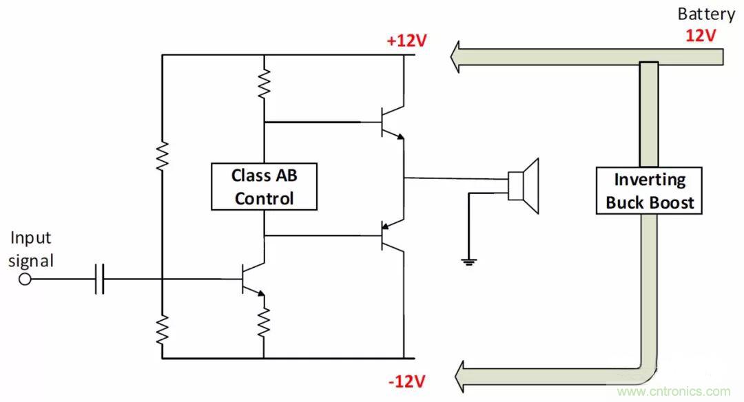 雙電源放大器比較常見,因為它效率更高,能夠在不導致DC損耗的前提下復制輸入波形。圖11A顯示了具有±12V軌的音頻放大器,圖11B顯示了具有±5V軌的運算放大器。