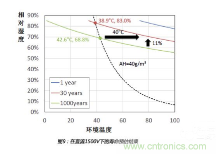 從上圖可以看出,相對濕度增加11%或者溫度增加40℃,都會造成壽命從1000年減為30年,所以,相對來說,相對濕度的影響比溫度影響更大。一般來說,當變流器內(nèi)部升溫時,絕對濕度會保持不變。如果環(huán)境條件從溫度38.9℃、相對濕度83.0%變?yōu)闇囟?2.6℃、相對濕度68.8%,但是絕對濕度值保持40g/m3,壽命會從30年增加到1000年。所以,預加熱是一種非常有效的抑制濕度失效的方法。