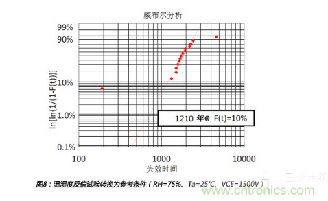 以上失效點集成為圖8所示的威布爾曲線圖,從圖中可以得到,在參考條件下F(t)=10%的壽命為1210年。同時,在此威布爾分析中,排除了最大點和最小點。所以,在參考條件下,3.3kV IGBT的壽命LTb=1210年。