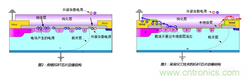 為了抑制IGBT芯片邊緣電荷集聚,SCC技術(shù)采用了優(yōu)化的半絕緣性材料替代傳統(tǒng)的絕緣材料,這個半絕緣性層為集聚的載流子提供了通路,如圖3所示,在高濕工況下,產(chǎn)生的載流子會通過半絕緣層傳遞出去,避免了電荷的大量集聚。