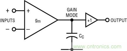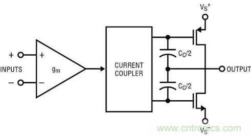 圖 1a 顯示了一個非軌至軌放大器的方框圖。輸入控制 gm 方框,gm 方框驅(qū)動增益節(jié)點,并在輸出端得到緩沖。補償電容器 Cc 是主要的頻率響應組件。Cc 的返回引腳應該接地,如果有這樣一個引腳的話;但是運算放大器傳統(tǒng)上不接地,電容器電流會返回一個或兩個電源。圖 1b 是最簡單的軌至軌輸出放大器的方框圖。輸入方框 gm 的輸出電流通過“電流耦合器”發(fā)送,這將驅(qū)動電流分成兩部分,提供給輸出晶體管。頻率響應由兩個 Cc/2s 決定,二者實際上是并聯(lián)的。