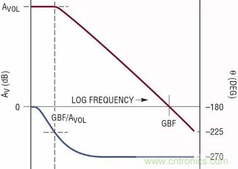 以上兩種拓撲代表了絕大多數(shù)使用外部反饋的運算放大器。圖 1c 顯示了我們的理想放大器的頻率響應,盡管兩個電路的電氣原理不同,但行為表現(xiàn)卻類似。由 gm 和 Cc 形成的單極點補償提供 GBF = gm/(2πCc) 的單位增益帶寬積頻率。在 GBF/Avol 附近,這些放大器的相位滯后從 –180° 降至 –270°,其中 Avol 是放大器開環(huán) DC 增益。當頻率遠高于這個低頻率時,相位就一直停在 –270° 上。這就是為人熟知的“主極點補償”,其中 Cc 極點主導頻率響應,隱藏了有源電路的各種頻率限制。