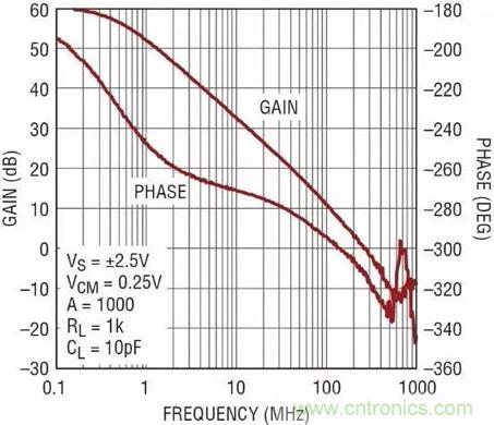 雖然 LTC6268 在單位增益條件下是相當穩(wěn)定的,但是有少量故意不穩(wěn)定的運放。通過把放大器補償設計為僅在較高閉環(huán)增益下保持穩(wěn)定,設計折衷能夠提供比單位增益補償方案更高的轉(zhuǎn)換速率、更寬的 GBF、和更低的輸入噪聲。圖 3 示出了 LTC6230-10 的開環(huán)增益和相位。該放大器打算在數(shù)值為 10 或更大的反饋增益條件下使用,因此反饋網(wǎng)將至少使輸出衰減 10 倍。通過這個反饋網(wǎng)絡,我們可以找到開環(huán)增益為 10V/V 或 20dB 時的頻率,并發(fā)現(xiàn)在 50MHz (±5V 電源) 時相位裕度為 58°。單位增益時,相位裕度僅約 0°,放大器會振蕩。