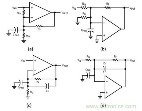 圖 5c 示出了在同相放大器中補償 Cpar 的優(yōu)選方法。如果我們設定 Cf* Rf = Cpar * Rg,則我們擁有了一個“補償衰減器”,從而使反饋分壓器現(xiàn)在于所有頻率下都具有相同的衰減,并且解決了 Cpar 問題。產(chǎn)品中的失配將在放大器的通帶中引起“凸塊”,和在響應曲線中引起“擱板”(此時,低頻響應是平坦的,但是在 f = 1/2 * Cpar * Rg 附近變至另一個平直線段)。圖 5d 示出了用于負輸出放大器的等效 Cpar 補償。必需對頻率響應進行分析以找到一個正確的 Cf,而放大器的帶寬即為該分析工作的一部分。