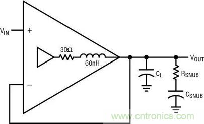 防止負載電容引起振蕩的最常見方式是,在反饋連接之后,簡單地給電容串聯(lián)一個小阻值的電阻器。10Ω 至 50Ω 的阻值將限制容性負載可能引起的相位滯后,并在速度非常高的時候,隔離放大器和低容性阻抗。缺點包括隨負載電阻特性而變化的 DC 和低頻誤差、容性負載頻率響應受到限制、以及如果負載電容在電壓變化時不恒定所導致的信號失真。