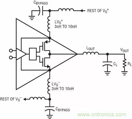 最后一個需要考慮的振蕩源是電源旁路。圖 10 顯示了輸出電路的一部分。LVS+ 和 LVS– 是不可避免的封裝、IC 接合線、旁路電容器的物理長度 (像任何導體一樣也是電感性的) 以及電路板走線的串聯(lián)電感。還包括將局部旁路組件連接到電源總線其余部分 (如果不是電源平面) 的外部電感。盡管 3nH 至 10nH 看起來似乎不大,但是在 200MHz 時,就是 3.8 至 j12Ω。如果輸出晶體管傳導大的高頻輸出電流,那么在電源電感兩端會存在壓降。