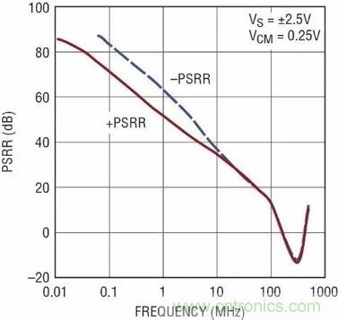 放大器的其余部分需要無噪聲電源,因為這些部分不能隨著頻率變化抑制電源噪聲。在圖 11 中我們可以看到 LTC6268 隨頻率變化的電源抑制比 (PSRR)。在所有運算放大器中,因為沒有接地引腳,所以補償電容器都連接到電源,會將電源噪聲耦合到放大器中,gm 必須抵消這種噪聲。由于補償,PSRR 隨著 1/f 降低,而且過了 130MHz 后,電源抑制實際上在變大。在 200MHz 時,因為 PSRR 的增大,輸出電流可能干擾 LVs 電感器內(nèi)部的電源電壓,通過 PSRR 的放大,干擾變成很強的放大器信號,驅(qū)動輸出電流、產(chǎn)生內(nèi)部電源信號等,導致放大器振蕩。這就是所有放大器的電源都必須用電感很小的走線和組件精心旁路的原因。此外,電源旁路電容器必須比任何負載電容都大得多。