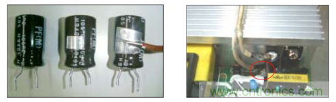 B.當電路板上電容所在的位置周圍有發(fā)熱器件(如功率管,散熱片等)時, 將溫度感應探測端接于電容靠近發(fā)熱源的側(cè)面鋁殼上,將對著發(fā)熱源的鋁殼表面膠管剝掉一小塊,用點溫膠直接粘連(或利用熱傳導率高的銀膠帶連接,用酒精等東西擦式表面后貼上銀色膠帶),溫度感應探測線另一端連接點溫機,如下圖: