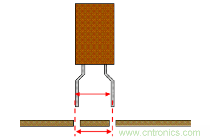 電解電容需要整形時,請使用電容引腳間距和基板焊盤間距一致的電容.如下圖: