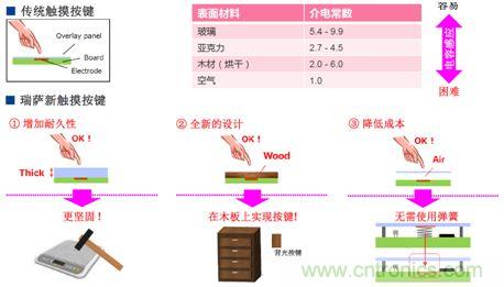 相對于傳統(tǒng)觸摸按鍵,新的觸摸功能按鍵可以透過10mm厚度的亞克力材料或者木板進(jìn)行感應(yīng),具有更加堅(jiān)固的耐久性,無需使用觸摸感應(yīng)彈簧。它與輕觸按鍵相比,耐久性增強(qiáng),并且具有抗污防水能力,可以大大降低按鍵的錯(cuò)誤率。