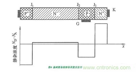 晶閘管各部分的摻雜濃度如圖4所示。其中與陽極和陰極相連的分別為重摻雜的P+和N+層,與門極相連的重摻雜P+層,此三層的厚度(在圖中體現(xiàn)為寬度)都較小,剩下的一層為相對輕摻雜的層N-層,其厚度較大,而厚度較大的輕摻雜對器件的耐壓和通態(tài)特性都有顯著的影響。