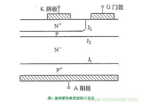 實際上一個典型的晶閘管的結(jié)構(gòu)如圖2所示,一般從陽極到陰極的雜質(zhì)半導(dǎo)體的性質(zhì)為PNPN,因此存在3個PN結(jié),從陽極到陰極依次為J1、J2和J3。此時,這3個結(jié)不再像