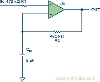 所有運算放大器都有一定的輸入電容,包括差分和共模。如果運算放大器連接為跟隨器,并且在反饋路徑中放入一個電阻以平衡阻抗,那么系統(tǒng)可能容易發(fā)生振蕩。原因是:大反饋電阻、運算放大器的輸入電容和PC板上的雜散電容會形成一個RC低通濾波器(LPF)。此濾波器會引起相移,并降低閉環(huán)系統(tǒng)的相位裕量。如果降低得太多,運算放大器就會振蕩。一位客戶在一個1 Hz Sallen-Key低通濾波器電路中使用AD8628 CMOS運算放大器。由于轉折頻率較低,電阻和電容相當大(參見圖3)。輸入電阻為470 kΩ,所以客戶在反饋路徑中放入一個470 kΩ電阻。此電阻與8 pF的輸入電容(參見圖4)一起提供一個42 kHz極點。AD8628的增益帶寬積為2 MHz,因此它在42 kHz仍有大量增益,它發(fā)生了軌到軌振蕩。把470 kΩ電阻換成0 Ω跳線即解決了問題。因此,反饋路徑中應避免使用大電阻。這里,何者為大取決于運算放大器的增益帶寬。對于高頻運算放大器,例如增益帶寬超過400 MHz的ADA4817-1,1 kΩ反饋電阻就稱得上是大電阻。務必閱讀數(shù)據(jù)手冊以了解其中的建議。