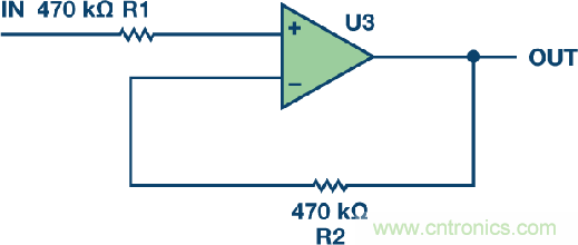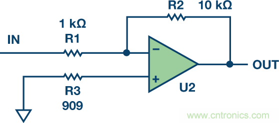 電阻熱噪聲的計算公式為√4kTRB,故1 kΩ電阻會有4 nV/√Hz的噪聲。增加電阻會增加噪聲。在圖2中,出人意料的是,雖然909 Ω補償電阻是值最低的電阻,但由于從該節(jié)點到輸出端的噪聲增益,它給圖2輸出端貢獻的噪聲最多。R1引起的輸出噪聲為40 nV/√Hz,R2為12.6 nV/√Hz,R3為42 nV/√Hz。因此,請勿使用電阻。另一方面,如果運算放大器采用雙電源供電,并且一個電源先于另一個電源上電,那么ESD網(wǎng)絡可能發(fā)生閂鎖問題。這種情況下,可能希望增加一定的電阻來保護器件。但若使用的話,應在電阻上放置一個旁路電容以減少電阻的噪聲貢獻。