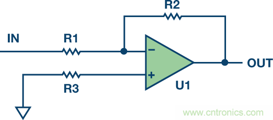 在同相接地輸入端增加一個與輸入電阻R1和反饋電阻R2的并聯(lián)組合相等的電阻(圖1中的R3),可以讓阻抗相等。做一些計算可以證明,誤差降至Ioffset × R feedback 。由于I offset 為I bias 的10%到20%,所以這會有助于降低輸出失調(diào)誤差。