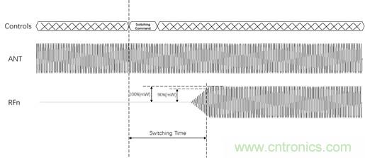 開關(guān)時間(Switch Time)或切換時間指的是開關(guān)從“導通”狀態(tài)轉(zhuǎn)變?yōu)?ldquo;截止”狀態(tài)或者從“截止”狀態(tài)轉(zhuǎn)變?yōu)?ldquo;導通”狀態(tài)所需要的時間。具體來講是指從DUT接收到通道切換命令,到在被切換到的通道上信號的功率達到滿幅度值的90%的時間。