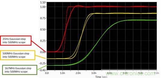 圖2:500MHz帶寬示波器對于不同階躍響應的曲線