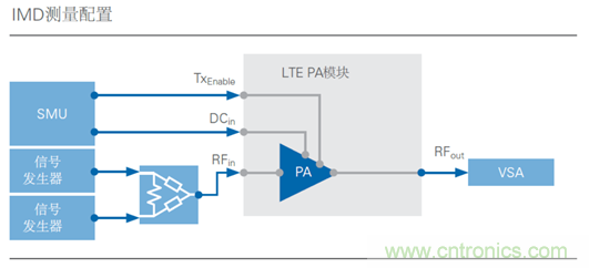 圖7: IMD測量需要連接至功率組合器的兩個信號產(chǎn)生器