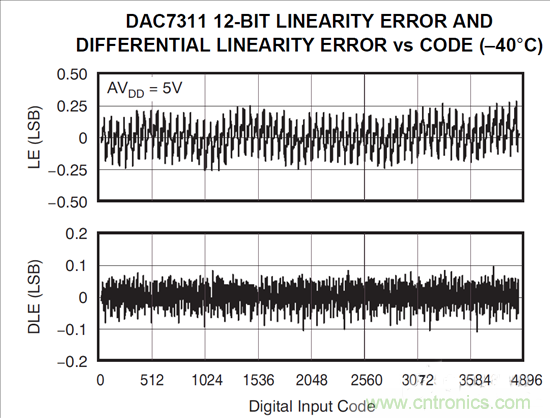 每個電阻器值的精確度可直接決定線性度。如果電阻串中任何一個電阻器的值不合適,我們就會在代碼轉(zhuǎn)換時發(fā)現(xiàn)相對于該電阻器的不良微分非線性度 (DNL)。此外,所有后續(xù)代碼的積分非線性度 (INL) 也會因為不匹配而產(chǎn)生失調(diào)。由于典型電阻串 DAC 設計中的電阻器數(shù)量龐大,我們不可能對每個電阻器都進行調(diào)整,因此只能接受一定程度上的 DNL 誤差。然而,仍然必須維持良好的 INL 性能,因此可經(jīng)常對各組電阻器實施區(qū)域化調(diào)整,以避免調(diào)整每個電阻器,其在以下 INL 圖中呈“階梯”狀。